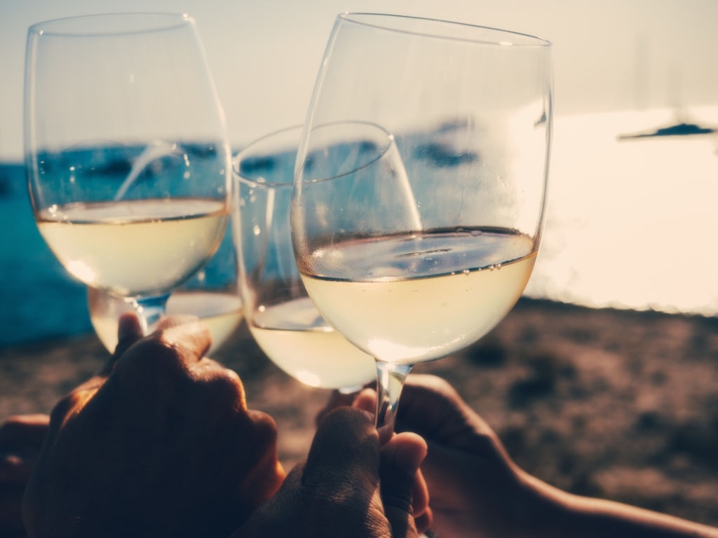Three people making a toast in front of the sea. Three glasses of white wine. Posted on February 11, 2021 by abbey_admin